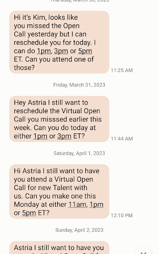 Read moreWell I'm so glad I didn't waste my time going to this appointment either. To be honest I thought it to be very suspicions after within a few minutes of answering questions online I got a call right away. So I tell the woman that I would be traveling out of the country and wouldn't be available to do any interview until the end of October beginning of November right. Ok well within that first couple of days I see a email saying that they were so pleased that I set up an interview that I will have an appointment within the following few days. Well at this point it's the beginning of October and I was very persistent over the phone that I would not be available due to traveling. So I emailed them stating this and saying why set one up when I'm saying I'm not availible and yet your setting up a date and time. (Hello Im not even going to be In this country duh) Well it happened again another email with a date and time and I ignored it and now just a few days ago again. I personally know that if you haven't really done this or new to it then why would a ligament company chase you if your basically a nobody in a sense not saying literally, but im sure you guys know what I mean. So that made me realize there's something fishy about all these emails and automatically seeing date and times for interviews that they hadn't even confirmed with me since I got back from my trip. Well now I see what everyone else is saying. When someone wants you because they think you could be a possible star later on than a real company would probably pay for your digital portfolio. Not tell you $500 for a digital portfolio & a monthly fee of $40. Well let's see if the company can scam 20 people in one month thats 5,000 dollars now I'm sure that out of the 20 people for there portfolio I'd say the company probably only pays $100 if that, towards each portfolio so that's 2,000 (this is hypothetical) So it's not a wonder why they blew up my email and called right away this is how they make money and I'm pretty sure they get more than 20 people a month that ends up falling for this scam. Thank you everyone who commented what this company was really about. I'm so glad I read these reviews. I always double check reviews when I'm second guessing and boy was I second guessing! And one more thing since the company seems to respond to these comments can you tell me since you've had this business for so long you've must have had one person that became a household name right at least one who...