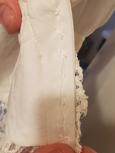 Regarding the work: there are strings hanging everywhere, a pull in the delicate silk, the lace on one sleeve is cut and flaps open awkwardly (as in one side flaps out and the other does not), and most buttons are sewn in very snugly, but a couple are very loose? Stitching on back side of cuff looks shoddy and haphazard. This was all work that they supposedly did so carefully it took a total of 14 hours and cost me $1866.88. This place is...