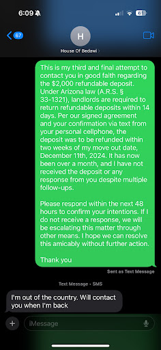 To make matters worse, the landlord (Jamel) frequently called me, sometimes several times in a single day, for conversations that were long, off-topic, and frankly intrusive. I was repeatedly asked to help him find tenants for other rooms, and he’d bombard me with texts asking me to bring in packages addressed to him.