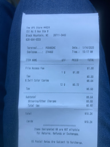 7 ½ years later, time for another review. They advertise they are open on Sundays from 11:00 a.m. - 4:00 p.m. Went there to pick up a package, flowers my daughter sent to me. They should have been delivered to my house, but that's another story. Well, the UPS Store was NOT open. See photo. Yellow sticky note on door said "Closed. Power Out" The power was NOT out. See all the lights on inside as well as the TV screens blaring out commercials. Flowers are probably dead by now. ...... Was at the Black Mountain UPS Store at 3:00 on Sat, Dec 16, 2017, trying to ship a package for Christmas. Clerk said it would not get there by Christmas unless I paid for "expedited shipping" because "you know" they are backed up with all the Christmas mail and online shopping. He said it would cost $88 or $67 to get it to Missouri before Christmas. UPS Ground would have been $30. I...