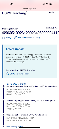 Getting one star only because you can’t give them negative stars. Ordered a package from n Nov 6th. Reached the Bloomingdale, IL (Chicago) facility on Nov 29th. From Nov 29th til December 10th there was no updates. Dec 11th it finally updated that my item was in Hazelwood, Mo (St louis) facility. There it has sat for 4 days without moving or any updates. When contacting customer service (which does not apparently exists) you get a pre authorized response email telling you you will be contacted in less than 48 hours. No contact what-so-ever comes. I’ve tried the contact option 3 times now. Twice by email & once by googling their customer service number which no one answers and when an answering machine does answer it tells you the voice message box is full & can not take any new messages. This company’s a joke!!!!! How pathetic!!! If my package even does show up which it is an handmade item I do not expect it to be in one piece or free of damage which will ruin this beautiful Christmas...
