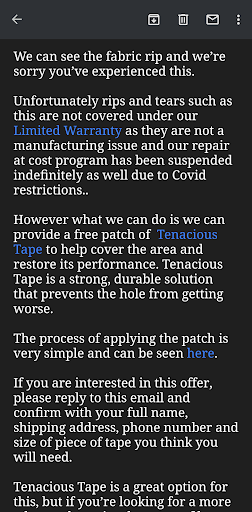 After a day the customer service rep reached back out to me apologizing on the stores behalf. Bottom line, the store failed at their job and sat on my jacket for weeks before mailing it in for repairs. The customer service rep promised to move my jacket to the front of the line for repairs which was very generous but also hollow. Either the gear is good quality and there shouldn't be much of a line for warranty repair, or the gear doesn't hold up to any kind of use and the line is very long. The really sad thing is that according to Google maps I could have walked my jacket from Minneapolis to the main office in Vancouver, Canada to hand deliver it for repairs and I would have reached them SOONER than it takes them to mail it.