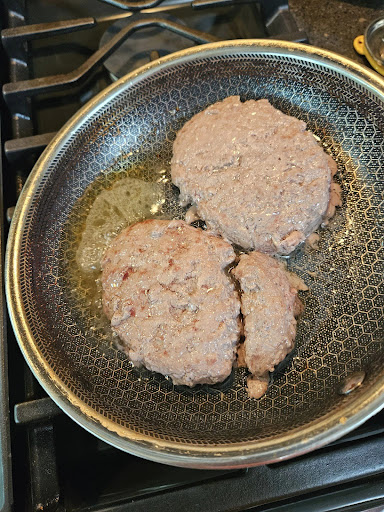 We tried this new local butcher shop. They have only been open a few weeks and the reviews have been very favorable. I guess I'm the first to be disappointed. First of all they only pack burgers in 2 to a package and they are 1/3# --- I prefer 1/4# so you get more burgers per pound and they are small enough for kids to eat. But the real disappointment was the amount of grease and water in the burgers. I didn't add anything to the pan except a quick spray because everything sticks in this pan if I don't. I have a quarter inch of liquid in the pan now --some of which appears to be water. It's hard to get a browned burger if it is cooked in water... Looks like we will have to continue to drive to Chamberlain Farms...