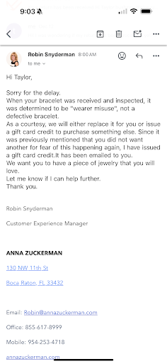 Read moreAbsolutely horrific experience with Anna Zuckerman Jewelry. I purchased a beautiful necklace and earring set for my wife for Christmas, along with a free pair of earrings as part of a “buy 2, get 1 free” promotion. What should have been a straightforward exchange turned into a nightmare due to incompetent management and abysmal customer service.