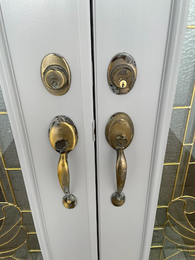 First, he examined the doors thoroughly and took my old lock hardware off. The doors are about 9' tall and after 18 years, they had imperceptively settled with time. Ryan installed new, longer hinge screws to re-hang the doors correctly. I would have totally missed this. The new locks looked identical to the untrained eye, but actually needed strike plate adjustmens and new post holes drilled for the heavier handles. (Photos attached).