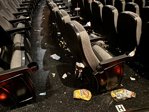 The trashcans in the hallways were overflowing, causing popcorn scraps to be strewn across the floor.