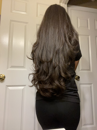 I walked in and she was so friendly and welcoming. We talked a lot about how I usually wear my hair for work, my concerns, my negative past experiences, and my hair goals. Like I said my hair is very thick and that was one of my biggest concerns because when I’m out of the shower and running to work and let it air dry it gets super puffy and is not cute. She asked if I wanted to try layers I said whatever you think. She gave me inner layers that made my hair half the thickness it normally is and I have never felt lighter and better. It was like a weight was literally lifted off my shoulders. I had walked in with long, boring hair that was growing close to my elbows. With zero style. Gina gave me inner layers to lighten up the volume of my hair and added long layers with long, framing curtain bangs that were so freaking cute and effortless to style.
