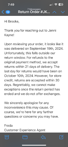 Absolute incompetence. Because this store has clothing on racks both torn and covered in makeup (um, is this Target?), I had to have a fresh dress shipped to me. No big deal. But rather than ship the dress to me that Friday so I would have it before traveling, the shipping store waited until THE NEXT TUESDAY to ship the dress to me. So, I didn’t even have it for the event I was counting on wearing it. So I had to go back to the store to return it (or so I thought). Instead, employees were unable to do so because instead of inputting my cc number in to order the dress, they chose to use a gift card (???), rendering me unable to return the dress only for a gift card I never had. Now I have to contact customer service, walk them through what their store did, ship the dress back to them, and then get my refund. This is certainly not the level of customer service I expect from a boutique at this price point. This is the last purchase I will ever make from Jenni Kayne.