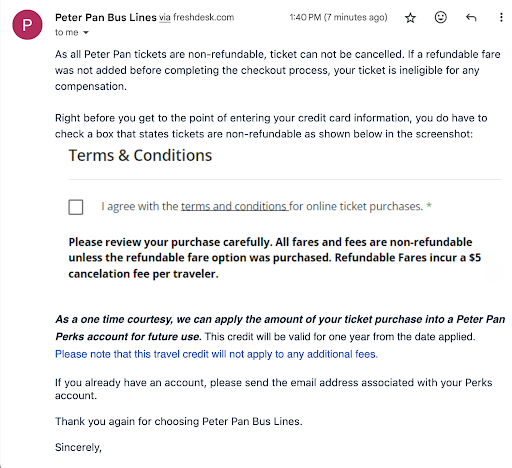 Their ticket confirmation email as well as the emailed tickets has all the information. Why is that not sufficient to get on a bus? It is 2014 and where many bus companies around the world just use e-tickets, Peter pan ridiculously did not let some passenger on board just because they do not have any paper tickets?