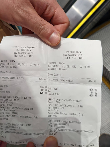 I hate to leave a negative review for a business (check my profile) but I feel my experience warrants it. I went into the Wild Duck on Washington St with my friend to buy a bottle of Aperol for a dinner party.