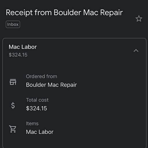 Two of my 4 USB-C ports on my MacBook Pro stopped working. I brought my laptop to Boulder Mac Repair. Dusty said there was nothing coming out of the two ports and the remaining two were failing as well. He said things like "cascading failure" and "motherboard issue" (not as a diagnosis but as possibilities). He said that I could leave the laptop for a minimum $95 diagnostic and then 4-5 day wait time to get my computer back. I wasn't ready yet to take that step as the laptop was essential for my work. I wanted to research alternatives. That evening, as Dusty predicted, the other two ports also died. I could no longer even power up my laptop. I was desperate to get it back to the shop as quickly as I could but first I did a search about the issue. I found that there was a 30 second fix that required resetting the system management controller (SMC). It only required pressing buttons while shutting down and restarting. All my ports are now functioning. I called them back to see if they either were not aware of the SMC reset fix or was something else going on. Dusty reported that he was indeed aware of that fix. He said it does not work 99% of the time.
