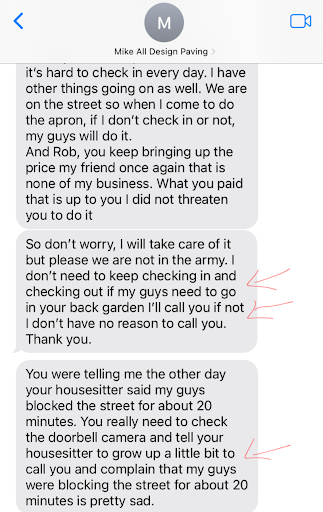 On top of that, professionalism was lacking. Michael showed up at our house unannounced, which startled our dog walker, and when we raised the issue he dismissed it, saying this âisnât the armyâ and he didnât need to let us know when he was coming. In over a decade of running a construction business, my husband has never spoken to a client that way or entered their property without notice.