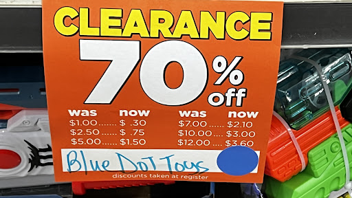 Today (August 18, 2023), I visited, and noted a sign in the toy section promoting 70% off the listed price on toys with a label with a blue dot. Naturally, I couldn’t find any product with blue dots. I did find labels with blue stars, yellow stars, yellow dots, and a fair amount of product with no price labels at all!