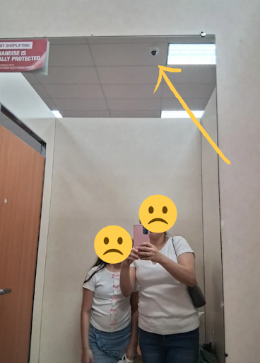 While in the women’s dressing room with my daughter, she noticed that a camera was positioned toward the mirror, which clearly reflects the inside of the dressing stalls. That means whoever monitors that camera has a full view of customers while they are undressed and changing.