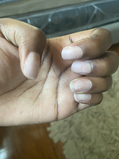 The place was busy when I arrived and, despite an appointment with Nikki, I had to wait about 20 minutes. But she was working on someone else and had another woman waiting in another chair in front of her, and she handed me off to another woman on the other side of the room. This woman (unsure of her name) started wrapping and soaking my nails to remove the old polish, but Nikki quickly told her to hand me off to someone else. He was a young guy who spoke little English, and he actually hurt me several times (and I have the scars today). He used a pretty thick drill, and in some places I could feel it hit me. It even left a sizable divot in one nail, and there are a few spots where he got the skin near my nails that is still painful a day later. He started trimming the nails but was having difficulty getting the length and shape right and only finished two before Nikki called me over to her. She really rushed through everything, and it shows. The nail lengths are uneven, two of the edges are super rough, and a couple of nails are not shaped at all. The whole time she was working on my nails there were two other customers sitting right there watching and waiting for her to finish.