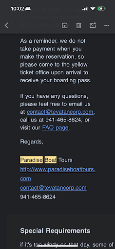 Paradise Boat Tours company cancelled my tour 10 minutes before the scheduled tour. The reason they gave and the way they handled the cancellation make us believe they cancelled the trip on purpose, because there werenât enough reservations and they simply did not want to send out the boat. Details below: We arrived 30min prior to the scheduled boat tour. We didnât find Paradise Boat Tours office so walked all the way to the fish pier. We saw an empty tour boat. While we were heading back and looking for the office, I received a call from a woman from the office 15min prior to the scheduled tour. She told me to look for a yellow building next to fish poles. A few minutes later, when I arrived at the office, she told me the tour was cancelled. The reason was Coast Guard suddenly randomly picked up boats to check to ensure the boats were safe after last hurricane. Paradise boat was in line for checkup. I asked if we could take the next tour today, she said the checkup would take hours and they couldnât guarantee a tour would be available for tomorrow morning either. They didnât offer a new date. We accepted their explanation and left. It was peaceful. However, after coming back, I realized the reason they gave simply didnât make sense: itâs been 5 months since last hurricane, why would Coast Guard ensure boats were safe now? Coast Guard would disrupt businesses in such an abrupt way? Why was there an empty tour boat at the pier? They didnât have proper customer service either: they didnât offer rescheduling. I think the reason they didnât take payment when I reserved the tour online was because it would be easier for them to cancel the trip in case there wonât enough people. I doubt on their honesty to customers.
