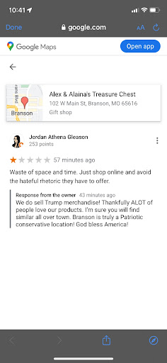 I also just saw on “WE’RE HERE!” (Documentary, HBO) a staff member from this store came outside and threaten three gorgeous drag queens for simply being there, outside, and walking down the street on a public sidewalk. He aggressively shouted, “You all need to leave the premises! The cops have been called!” I paused watching to look this place up and review it to warn others about this bigoted and clearly dangerous person who thinks it’s against the law to exist if you’re wearing a costume. (Guess he’s probably not a big fan of Halloween, then, either. Hide your children! He may call the cops on Little Jimmy if Jimmy wants to be a mermaid for Halloween.) BUT SERIOUSLY, to all my Queer folx out there, y’all be careful and AVOID THIS STORE IN BRANSON, and maybe even Branson in general. If this clown felt supported by his community to come out and holler at and harass three grown adults wearing costumes, then it’s likely that the majority of the community behaves in the same...