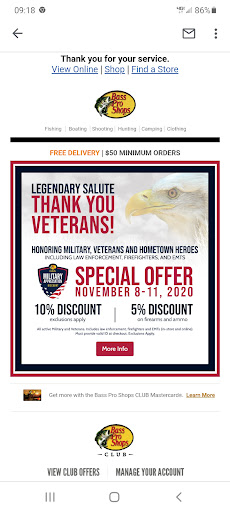 Seeing the e-mail does not convince me that Bass Pro wants to honor veterans but rather include as many groups as possible and therefore make more sales. Sorry to sound hateful but that is my legitimate feeling.