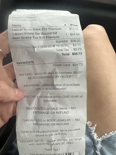 Read moreLiterally the worst quality ever. I bought a thread less piercing less than 24 hours ago and it broke. I have owned threadless piercings in the past and this has never happened. When you go to bend the post, it completely snaps off. A $40 earring should not snap when you are bending it how it’s supposed to. Not to mention before it broke it barely wanted to stay in the post. I went in to see if I could exchange and was told there were no refunds. Makes sense, they must know their jewelry is cheap and will break. All they offered was 50% off another piercing. It says exchange within one year, but they no longer had my piercing and refused to let me swap for another! Why would I spend more money on a piercing that...
