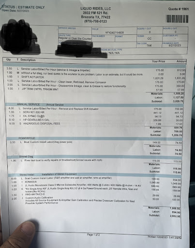 Ā Ā Ā Read moreSent brand new 2023 boat in multiple times for transmission overheating. Each time I was charged and was told it was fixed. Within about 30 minutes of being in the water each time, I got the same overheating message. Mechanic said I needed a new transmission. I disagreed and asked for receipts for the "work" they had done. I called, emailed, blasted on Facebook. Owner, Kevin, deleted me from Facebook and sent a private message asking why I blasted him and his business. I explained, yet still never received any paperwork. They also broke both of the hydraulic arms on the engine cover, which they did provide me with new ones, but they wouldn't put them on. Hauled it to Houston (LMC Marine - highly recommend!) and it turned out to be a bad temp sensor which was covered under warranty. They even washed my boat for free versus the $505 Liquid Rides charged. I'll never return nor vote for him for Sheriff! There are better places to go if you're willing to...