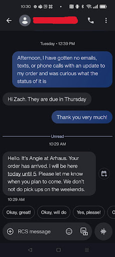Fantastic high class quality furniture. Wish I would have listened to other reviews and not expected high class service to match. Truly disappointed in the customer service provided by Angie and the lack of care or effort that was made when it came to our purchase. Our product looks fantastic and the packing was great, but could not have felt more like we were unworthy of someone's time. We came in on a Sunday to purchase two nightstands we had seen online. We decided to place the order while in store for in person pick up as it was just two nightstands and Angie was very helpful while in the store. Discussed in front of Angie picking them after work during the week or on Sunday in the future as that is when we are often in the area. Angie did not note any issues about our plan for pick up and said it was smart to save on shipping. We were able to place our order and everything seem fine when we left the store even though there was a hiccup with payment at the register. After a week of not seeing an invoice via email I called for an update and found they did not correctly write down our email address or phone number. With that corrected Angie provided an updated timeline and it was several weeks out and we were fine with that. After that timeline passed and we had not received an update we followed up again via text and were told that our item would be in on Thursday. On Friday at 10:30am Angie sent a message that said we must come pick up our item before 5pm and that we could not pick up our items on the weekend. Confused we asked why as we both work until 5pm and that was not what we had discussed previously. When we did not receive a response via message we called the store. While on the phone Angie said she only worked until 5pm and that's why we needed to pick up the items at that time and that we would need to 'figure it out' as to when we could pick up the furniture. One of her coworkers overheard the phone conversation and thankfully offered to assist and she begrudgingly agreed to allow us to pick up the furniture while she was not there on Sunday. Sunday pick up was extremely smooth and we hard no issues loading the items ourselves and the team member that helped us was very helpful and considerate. Photo attached of text message...