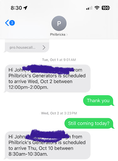 My wife and I hired and joined Philbricks’ generator service program under the belief that we were working with a reliable local company. Unfortunately, our experience has been defined by misdiagnosis, poor communication, missed appointments, and billing practices that we believe are misleading at best. • In June, our generator began throwing error codes. Philbricks quoted us $1,160.08 to resolve the issue, stating the problem was the control panel. • after dodging scheduled appointments and no showing - On October 10th, their technician installed the quoted part. We paid the invoice in full that same day. • Within five days (October 15), our generator began throwing the exact same codes—clearly indicating the original issue was not properly diagnosed or fixed. • From October through mid-November, we had to repeatedly follow up with Philbricks to get any progress or communication. Appointments were missed, rescheduled, or delayed without notice. We were told a new part would be ordered at no charge. • After the second repair attempt on November 19, we received an unexpected second invoice for approximately $1,800—despite never being told in advance that additional work would carry any cost. • We were even prompted to leave a 5-star review before receiving this surprise bill. When questioned, we were told not to pay it yet and that the matter would be “finalized in 3 weeks.”