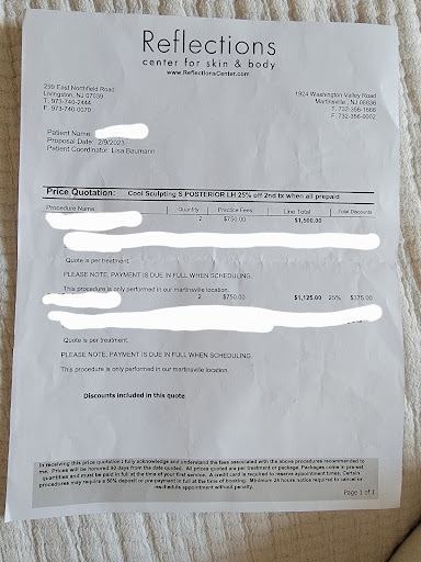 Read moreI have been coming to Reflections in Martinsville for about 2 years now for laser hair removal. I had completed all recommended sessions when attending college at a different spa, so my visits to Reflections was primarily regarding routine maintenance for my area of concern. The sessions had already done their job back in the day - I just had minimal hair growth every 6 months or so due to hormones. Still, before my first session at Reflections I opted for a consultation to ensure I was comfortable with the providers, facility and price-point. What attracted me to this location was (1) cleanliness (2) openness/kindness of the staff - ranging from the front desk associates to the techs accompanying you into the laser room and (3) the fact that I felt 10x better about a major insecurity of mine upon entering the door. So why the 1 star?