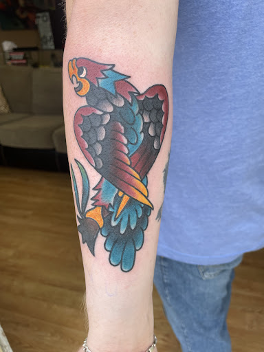 Read moreThis Bon Scott Parrot is one of the 5 colorful traditional tattoos that Iâve had the complete blast of getting from the man himself! Not many people know how to make traditional the right way. Heâs able to make them unique in their own way that you didnât expect when coming in. From the first time he gave me my small âScrewballâ tattoo I knew I found a new artist!! Heâs been tattooinâ a long time for...