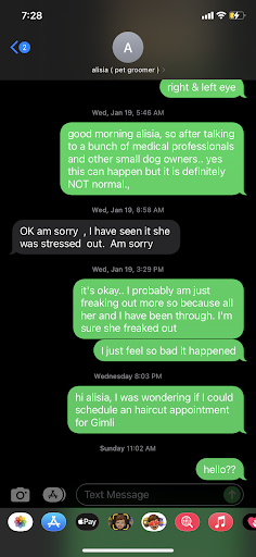 Alisia cut my dogs hair for the second time of her life at 7 months and Completely choked the dog to the point of full hemorrhaging in both eyes.. I contacted her about it and asked her what happened and she said that it was normal.. I contacted my vet and of course she assured me that that was not normal and to let that groomer know that it’s NOT normal and that hemorrhaging is only caused by eternal bleeding which is caused by choking.. I was still kind and forgiving giving her the benefit of the doubt in hoping that it was just an accident but shortly after trying to reschedule with her I was completely ignored and after several texts asking where she went she told me that it wasn’t the best idea for her to cut either of my dogs hair anymore.. and that is enough sad for me....