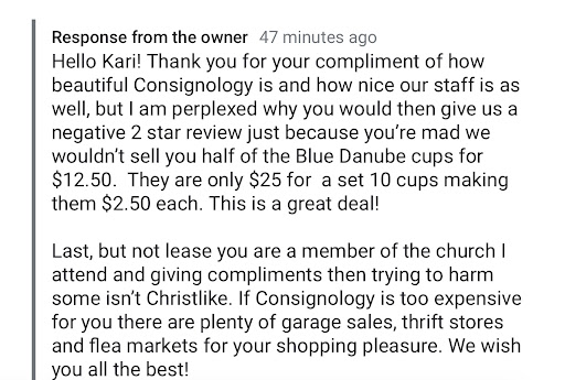 Edit: responding to the stores response, just wow… pointing out my faith and chastising me for not being Christlike??? Take a look in the mirror. That is completely out of line and unprofessional. My comment is not harming the store, I’m giving my honest opinion. If you can’t handle that, then maybe you should do some self reflecting. The only person harming your “reputation” is yourself. And I’m not upset by you not selling me those cups. Goodness, they are just cups!!! And honestly, I don’t understand why you wouldn’t want to sell me half the cups when you wouldn’t be losing any money if you kept the remaining cups the same price. Additionally, a business savvy mind would’ve taken the opportunity to up the cost of the remaining five cups and gained more profit afterwards, because let’s be real here, you are more likely to sell a set of five then a set of ten. Now, in all fairness, the real reason I’m upset is by the fact that I walked around for an hour with a baby trying to find a few gifts within a budget (a reasonable budget for used goods) and found nothing. It’s also not the first time I’ve been in your store and come away with nothing. Makes me wonder how many others like me have walked away from your store empty handed. Others should be aware that they will be spending a pretty penny on USED items that look like you picked them up from thrift stores and garage sales… and you should be aware that you will go out of business if you keep treating your customers this way. I’m disappointed by your gaslit response and will not be coming back. … also, you spelled my name...