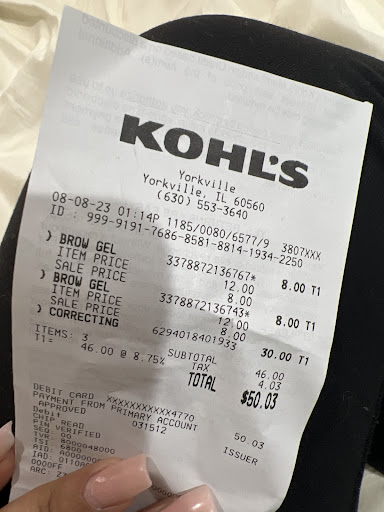 Read moreI am seriously disappointed in the check out process. The girl was to busy horsing around with other co workers. From throwing hangers, talking and laughing and carrying on like I and my daughter and my $500.00 plus transaction didn't matter. She didn't offer a me chance to apply for the Kohl's credit card. When tried to use my Kohl's rewards she told me I couldn't and processed to talk to me like I was 5years old. When I tried to respond to her or talk to her, her other 2 co workers were busy talking and laughing so loudly she couldn't hear me. So I had to YELL over her co workers that were by her register. Then she said, what I can't hear you! So I stood there waiting until the other 2 co workers left. She did not like that. But I was tired of having to yell at her just to respond to her question. Plus, I bought my daughter a necklace earrings set, regular price $50.00, on sale for $19.99, UPC 798676412080. Someone placed tape on the back of the necklace so it appeared to be OKAY. Once I tried to remove it, I noticed it was BROKEN!!! We do not live close to any Kohl's, so when we head there we plan on at least 4 to 5 hours. Returning the necklace would cost me more in fuel...