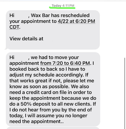 Read moreHonestly pretty disgusting and disappointing service before even getting to my appointment. I booked this wax almost 3 weeks ago. I booked at a time that was convenient for me as one does. I get a text today saying my appointment was rescheduled an hour earlier. No communication just changed my appointment without my approval of it. Then I get a nasty message from the owner herself saying my appointment got scheduled to 6:40 (which is 20 minutes after what the text above told me) and saying how I need to respond to her by the end of the day otherwise she will just assume I dont want it. Dont go here, she cancelled my sisters appointment when it was my sister’s birthday and now has rearranged my appointment because it inconvenienced her too much to get me in at my scheduled time. She will cancel on you too when she books back to back...