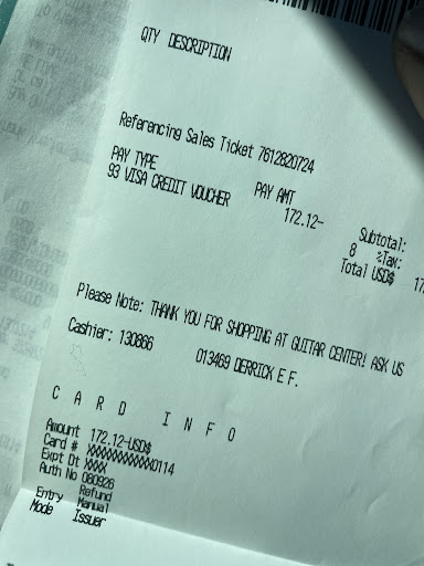 Read more[ ] I started taking drum lessons at Guitar Center about a year and a half ago. My instructor Jazz is amazing , she taught me so much and made the experience enjoyable and relatable. Unfortunately, my positive experience with her was overshadowed by poor handling of the billing process. After noticing inconsistent payment withdrawals both in timing and amount I placed a lock on my card. I reached out to Kenny (the Lessons Lead) to request clarification and to ask that my billing be aligned with my income schedule, as surprise charges were causing financial issues for me. I sent a detailed and respectful email on May 20 requesting specific answers about billing, including why charges were not consistent and how reschedules were affecting my balance. Rather than address any of my concerns, Kenny responded by canceling all of my lessons with no explanation, no discussion, and no offer to help me resolve the issue. This made me feel like my concerns didn’t matter and that all they cared about was getting a payment through, not supporting a loyal student. This review has nothing to do with my instructor Jazz, she is amazing and deserves recognition but it has everything to do with how this facility is managed. The store smells like a sweaty men’s locker room, and some employees are outright rude or dismissive. I’m not writing this to deter anyone from coming in, but to share my experience in the hopes that this location improves how it communicates with and treats...