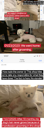 Read moreTook my puppy in for grooming service since this was her groomer to begin with before I switched elsewhere and kept them as a backup. I dropped my puppy and picked her up 4 hours later just like I dropped her off not only does she hate being at the groomer but 4 hours with a terrible service only thing you can tell they did was give her a bath and left her with a bald spot on her neck and back no sign of haircut .Came home everyone asking what happened to her getting a haircut. When I made the appointment they never bothered to say her groomer was no longer working there Iâm beyond frustrated and disappointing this was a waste of 75$ and they failed to understand my frustration! Terrible service they need lots of grooming training and customer service training. Then I was told the groomer didnât really want to groom my puppy cause she was barking , if you felt so scared of a 7 pound chihuahua that was all you had to say and we wouldâve gladly took our money elsewhere.Do not bring your fur baby here I am warning you all! Mindy the owner is in business for all these years which has me questioning how? With her rude self! They need to shut this place down and I will support the shutdown after my experience today. No customer who is paying for service should have to feel like this.This has me questioning race has...
