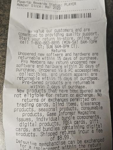 Read moreNothing like spending $750 for an xbox bundle, then going to the store to get partial in store credit on the game it comes with(yes I knew ahead of time it would only be worth about 1/3 of its purchase value), only to be met with assumptions that the was stolen because it was brand new with wrapping. Instead of being asked if we had the receipt, or letting us know that they would need a receipt to trade the game in, the first thing I was told was "we don't trade in games with the wrapping because of theft" glad the manager hiding in the back of the store was able to clear things up, so we could take another 20 minutes figuring out how to apply a gamestop gift card that was provided to me... from gamestop...for purchasing the Xbox bundle... Don't go to this location, you will be sorely...