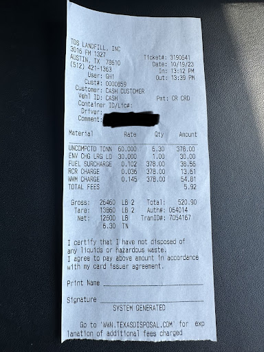 Left there and went to TDS (Texas Disposal Systems) Landfill at 3016 FM 1327 Creedmoor, Texas 78610. They are open from 7am to 7pm (or sunset, whichever is earlier) on Saturday. This is awesome because it's later than the 7am to 12pm most are open on Saturday. Super easy just backed up to a pit and threw the trash out the back. It was raining so the Uhaul was bonus, kept us out of the rain while we unloaded. Since I was so full, they had me weigh the truck, leave my card with them and when I came back they charged me $90 for the 3,300 lbs. What they said was anything under 4000lbs is a standard $90. Not sure how it works if you have a small truck load... maybe someone can add what that typically costs. Got there about 8:00am left around 8:45am. Early morning was a good choice.