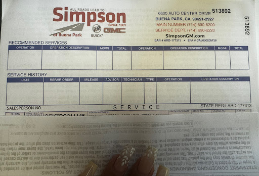 To start, making the appointment was very quick and easy with Matthew. Dropped off the vehicle at 9:30ish and picked up at about 4pm. However, once service was complete there was one big issue. My new truck that I had taken in for service for the first time now has a nice hand print due to the lack of workmanship from one of their techs. I have reached out to see if Simpsons own detailer may have the opportunity to correct their techs mistake but it looks like they arenât trying to do that now. I had to reach out twice and ask about an update and now have not received anything in return. I take pride in having my vehicles in good shape and am now bothered by this hand print âsouvenirâ anytime I have to use the vehicle. I will probably need to have our own personal detailer take care of it since I donât think Simpson GMC of Buena Park will be doing anything in this regard. Maybe foot them the bill if anything. I donât think anyone with any vehicle whether older or newer would want a stain like this in their car after service. Will try to reach out via text again to get an update. Beware if you decide to bring your...