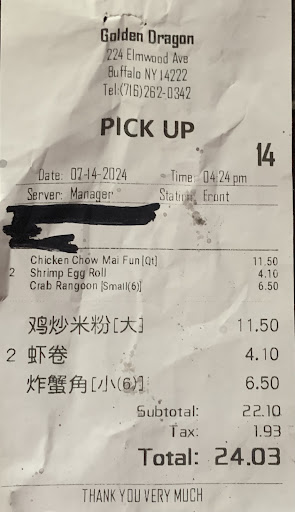Read moreElmwood Avenue Golden Dragon on Elmwood Avenue. I want to say when they first opened, The food had flavor and was fresh. Not anymore. I actually gave them four tries to get it right, it got worse. I would also agree with the other reviews. I've read about the skimpy amounts of Protein, seafood, chicken, pork. I received mostly noodles with six pieces of chicken in my last order which was undercooked. Rangoons had barely anything in them ,Mostly wrapper. I brought the food back that I didn't finish and told them that they failed. I didn't want my money back or anything. I just wanted them to know. I gave them the reasons. With a blank look on His face he said he would let The manager know. I never received a phone call from the manager, So I posted a review. I Don't like to give a bad review. But at this point it's so necessary to let people know. I don't mind paying for delicious food. But I don't want to overpay for terrible food. Nor should you.