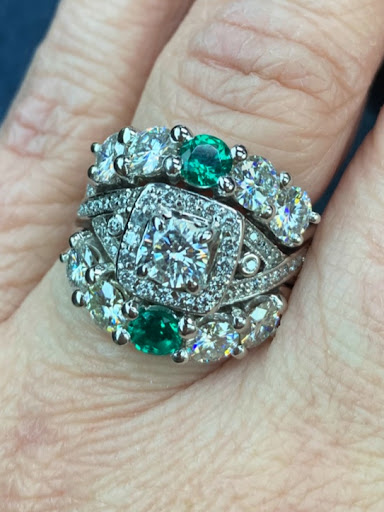 Gayla suggested having the ring refurbished, basically going through all of it to get it back to its glory. I told her I wasn’t happy with my center stone because I couldn’t get to it to clean it well enough. I had previously had it raised instead of sitting flush as it originally was. So going over this I told her maybe I just needed to upgrade and raise my diamond again. And to my surprise, she actually said “ let’s do the refab first and revisit going larger and raising it later” she told me that they could absolutely do it, but to see if her jeweler had an idea about getting more light to the center stone. My ring is an Art Deco inspired piece that I had picked out just before the Art Deco design was coming back in nearly 20 years ago or so. Our 16 year Anniversary I had ring guards custom made with emeralds because we were married in May. It’s just a gorgeous piece. All of this was done by my previous jeweler.
