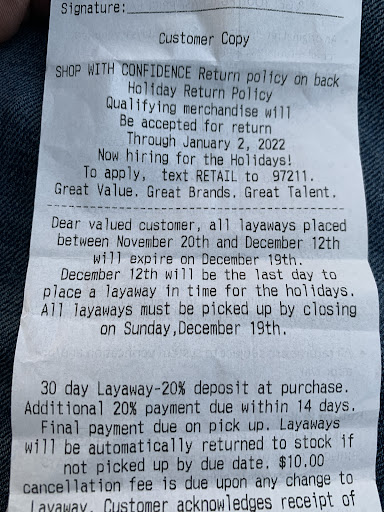Read moreI will never again step foot in this store, and I normally can stop 1 time a week or more on some occasions. The last 4 times I’ve been in this store I have waited OVER 30mim to checkout. TODAY, I was attempting to return a dress, with the receipt, my daughter had pulled the tags off when trying it on, like a lot of kids. I was told that I could not return the dress without a tag. I read the return policy which states NOTHING about a tag. Yet I walked to the kids section (after waiting the initial 30+ min to reach a cashier) found the identical dress, matched the style number exactly with my receipt.i did not want the identical dress, though I had other items to purchase. The store manager told her employee that she could not do my exchange . Only after I started to read the return policy out loud did she come over and tell me that “we aren’t doing this in here today”. Eventually after my persistence and her actually taking a moment to LISTEN, did she then tell the employee how to proceeded with the exchange. 20 mins later… so 50 MINUTES!! To check out!! The time before that I left my cart full of merchandise after waiting 40mins and had to be at a appointment. AND refusing to do exchanges WITH the receipt… AND not allowing fitting rooms“We lost the key” this week, is insane. I’m sure this review will go unnoticed by corporate just like the rest of them. Maybe I can save someone the time and effort of not stopping here. My time is much more valuable than the...