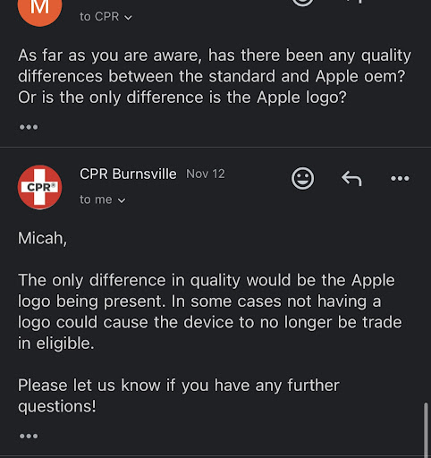 The most upsetting part of this situation is that I was sold an aftermarket part under the false pretense that it was of the same quality as Apple-certified parts, just without the Apple logo. I thought having a backglass without the logo would be unique, but I would have never agreed to it if I had known it was of lower quality. My top concern throughout the entire process was durability, and I made that very clear. It feels unfair to have been misled, especially since the part has already failed...