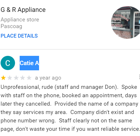 This company has been awful to deal with. Wires behind my stove were melted because the company I purchased it from put the power cord on wrong. As if that weren’t scary and frustrating enough, thanks to G&R, I was without a stove for ONE WHOLE MONTH! They called and scheduled an appointment with me for between 9am and 1pm. At 10:30am, they called to cancel because the tech was “sick”. I rescheduled for another day. They came and said they had to order parts so couldn’t fix anything until then. I never received a call... I then called to ask when the parts would be in and woman on the phone told me and then scheduled an appointment for between 9am and 1pm. Well, the just DIDNT SHOW UP! I wasted my whole morning waiting and they didn’t show up. I called and complained and the man was so rude and told me I definitely didn’t talk to anyone and never scheduled an appointment. After an entire day of calling them and speaking to many different people and trying to get my stove fixed, they “were too busy to fit me in” so I waited even longer. They also said they wouldn’t charge me for the power cord I needed since they inconvenienced me so much. They FINALLY fixed my stove and STILL charged me. They’re rude to deal with and obviously not reliable. They were...