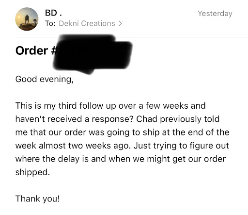 From this point on, starting at the shipping notification, over the course of over a month, Dekni would ignore all further communication with me. Overall, I was ignored entirely by 2 separate representatives over the course of several polite email attempts. I had already engaged in communication prior concerning the proofs, so it was clearly established they could receive my emails.
