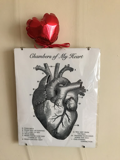 My husband was drawn to a black and white drawing of a heart - labels were "when I think of you" style (non-medical), pointing to different parts of the heart. (I'll post a picture later). A different kind of romantic nostalgia for us to remember our Thanksgiving...