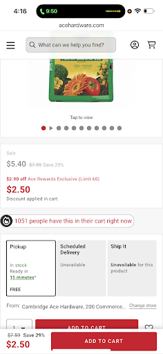 Horrible customer service. Went there this morning with my young son to purchase garden soil. On their website it shows that if you are a member you get the members price of $2.50 a bag, otherwise the sale price is $5.40 and the regular price is $7.59 (see attached picture). I believe there were 5 or 6 employees âworkingâ in the store at the time one of the younger employees helped me and was going to charge me over $8 a bag. I told the employee that wasnât even the regular price of the bag and that the bag is on sale and that I am also a member. He told me that just because it is on the website that it doesnât mean it is the same price in the store. Confusing and doesnât make sense if their online price doesnât reflect the store price. I told the employee that I will just purchase it on my phone then since they wouldnât sell it to me and were actually going to over charge me. So I stood there on my phone and purchased 14 bags of garden soil. Not one male employee asked or offered to help me load it into my vehicle. I am a capable woman and can load it myself but when you have that many employees standing around wouldnât it have been a good opportunity for one of them to work and help load it or just be a gentleman? When I left I drove by one of the employees standing outside smoking a cigarette. Thanks Ace Hardware definitely will go to a different location...