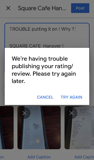 I just got a question on my phone about one of my reviews every time I try to answer it or others -the questions disappears ! They are not in my emails ! Why ? 4/2023. Second message to google! I spent a long time redoing the review 3 times for the Square Cafe - you won’t let it on … why please??? It won’t let me put pictures of the food we had in review ! ??