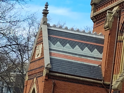 Sunlight has faded, but not weakened, the slates of Memorial Hall, put up in the 1870s. Slates varying in color from similar ones around them are replacements. The soaring central tower was clad in patterned slate until 1897, when it acquired clocks and copper sheathing. The tower burned in 1956 and had not been replaced until August 1999, that it received its final facelift.