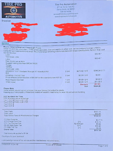 Read moreOn my way from Flagstaff to Phoenix on I-17 my trailer blew a tire. I didn't have a spare, was 15 miles out of Camp Verde and businesses were due to close soon. I thought I would be getting a hotel room for sure. Enter Don Hanks, owner of Tire Pro, who took the time to appreciate my situation and prioritize my one little trailer tire so I could get back to my unsecured load quickly. Since I didn't have the original wheel on hand (lacking the proper jack, had to buy one of those too), Don helped me figure out which of so many lug pattern and tire size combinations I needed to obtain. It was important we get it right the first time because I wouldn't know I'd gotten the wrong wheel/tire until after Tire Pro had closed. But Don also wrote his cell phone number on the back of a business card and offered to come back to the shop to get me the correct size. As it turned out we got it right the first time and I never had to bother Don that evening. But if I'm ever in the Camp Verde area again in need of wheel or tire services, you can sure bet I'll go see those guys...