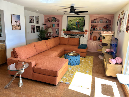 I got a custom U-shaped Alton (they don't advertise being able to customize the layout on the website, but to do so you just need to set up an appointment with one of their designers). I chose the Durham-Tangerine fabric. It is super vibrant and the texture is soft and cozy. The legs on this couch are Espresso, but basically look black in reality which I'm cool with.