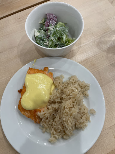 Then we went back to make our salad. We reached under our table and pulled out a bowl of I think lettuce, apple and some other veggie? I donât know because I didnât see them in full form or chop anything. Then our table of 6 got to make the dressing and by that I mean one person whisked while the other dumped the âalready measured by the chefs before the classâ ingredients. Finished.